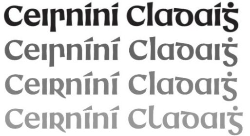 Tá Cruinnchló GC bunaithe go scaoilte ar an litreoireacht i lógó Cheirníní Cladaigh - lógó atá le feiceáil in uachtar sa léaráid thuas. Cló taibhseach soléite is ea é. Tá sé róthrom le húsáid i dtéacsanna fada ach oirfidh sé do cheannteidil agus don chomharthaíocht.