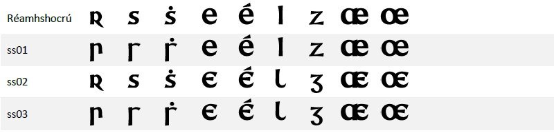 Tá na leaganacha inseacha de 'r', 's' agus 'ṡ' le fáil mar mhalairtí stíle (stylistic alternates) i gCruinnchló GC. Lena n‑úsáid, roghnaigh stylistic set 1. Chun leaganacha malartacha de na litreacha 'E', 'É', 'Æ', 'Œ', 'l' agus 'z' a fháil, roghnaigh stylistic set 2. Tá na leaganacha malartacha céanna le fáil, in éineacht leis na leaganacha inseacha de 'r' agus 's', in stylistic set 3 mar atá léirithe sa tábla thíos.