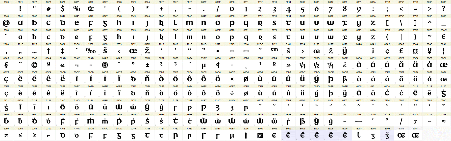 Tá Cruinnchló GC códaithe de réir Unicode, an caighdeán idirnáisiúnta, agus tá na carachtair go léir ann léirithe anseo. Is féidir sampla de théacs a clóbhuaileadh leis an gcló seo a léamh má tá Acrobat Reader ar do ríomhaire agat.