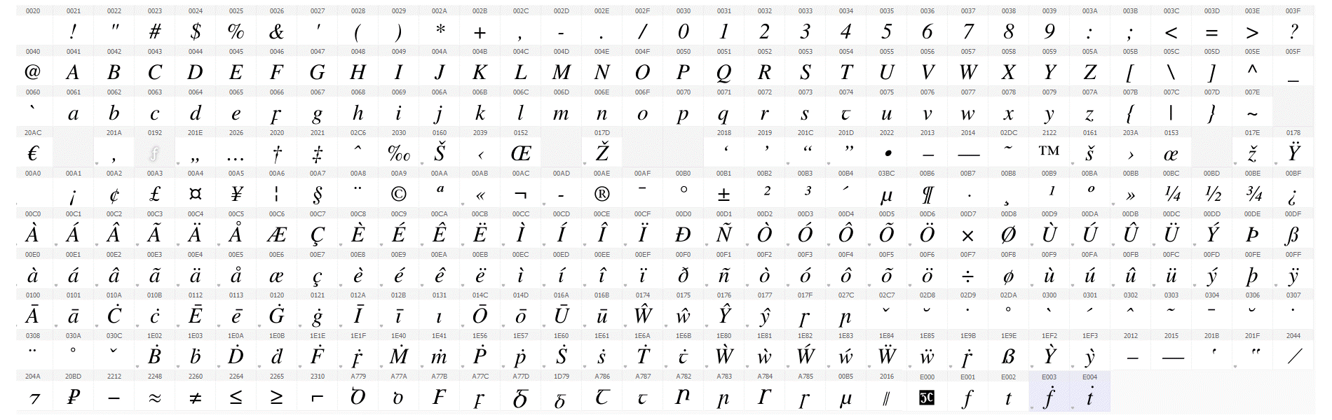 Tá an cló seo códaithe de réir Unicode, an caighdeán idirnáisiúnta, agus tá na carachtair go léir ann léirithe anseo. Is féidir sampla de théacs a clóbhuaileadh leis an gcló seo a léamh má tá Acrobat Reader ar do ríomhaire agat.